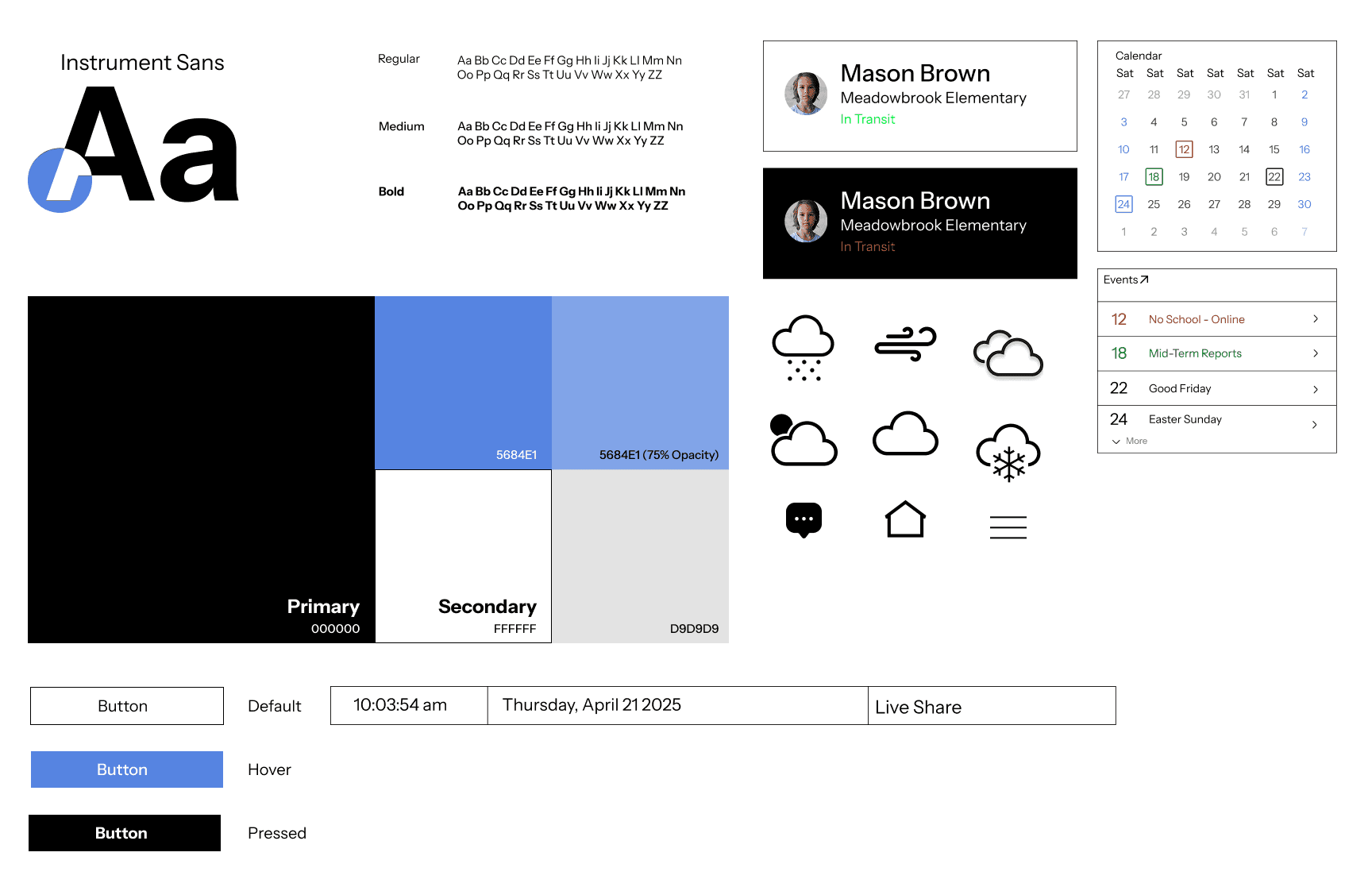 The design system for MTN Live is parent-first: typography that feels familiar, colors that signal urgency without noise, and components that communicate information. By grounding the system in consistency, parents can navigate confidently, knowing that updates about their child’s safety are always legible and reliable.